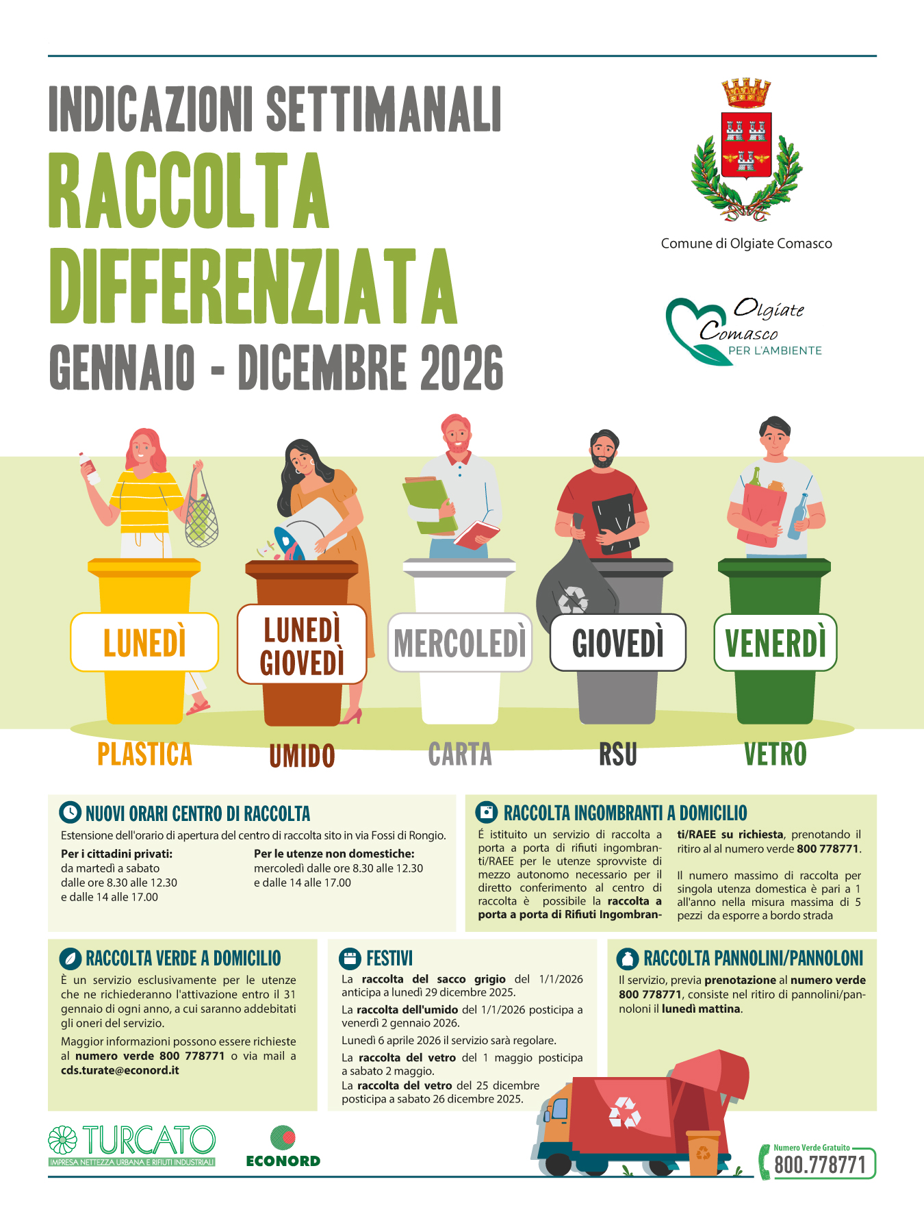 Ad Olgiate Comasco è attivo un servizio di raccolta porta a porta per 7 diverse tipologie di rifiuto, che vanno separati e conferiti utilizzando contenitori o sacchi di colori: